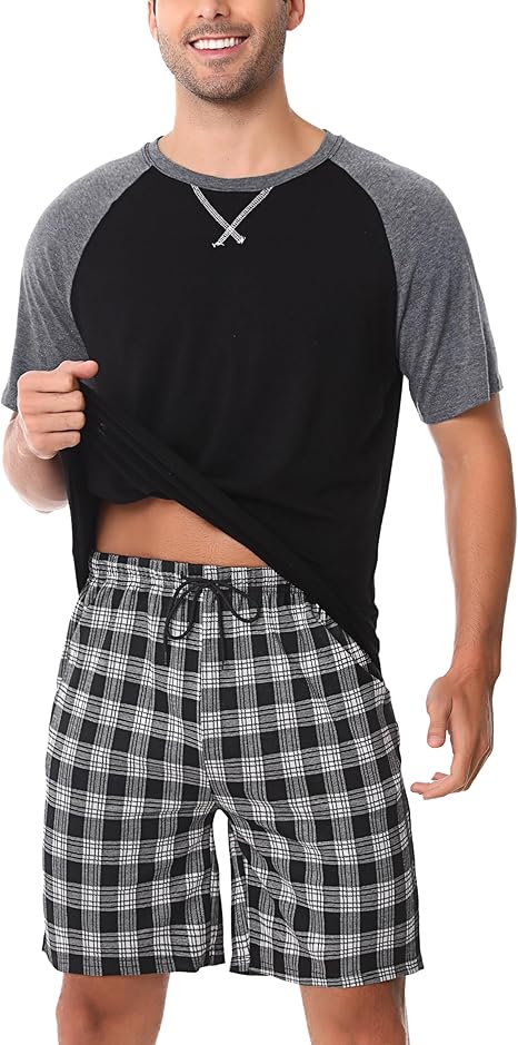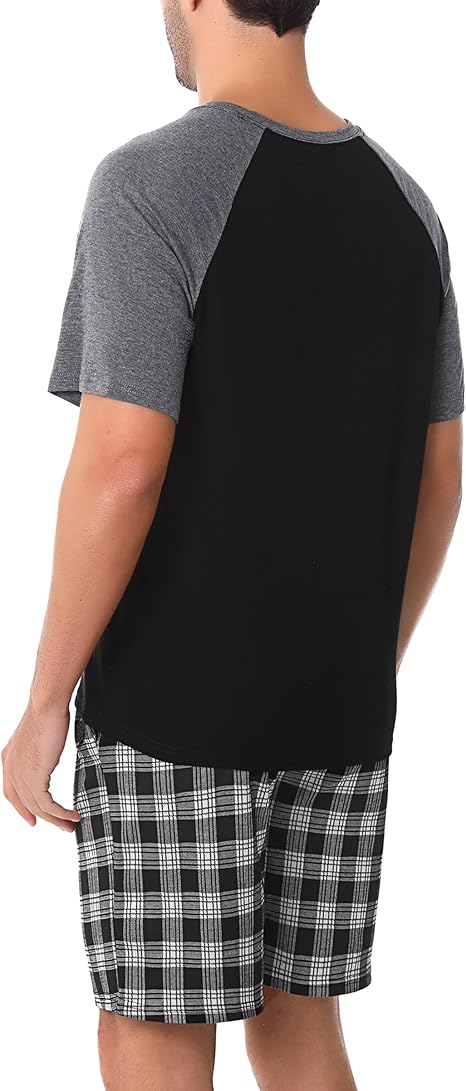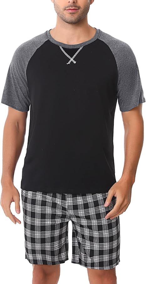Litherday Men’s Pyjamas Set Cotton Summer Short Sleeve Sleepwear Loungewear Plaid PJs T-Shirt Top & Shorts Bottoms Two Piece Nightwear with Pockets