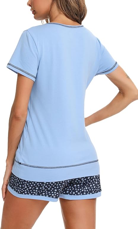 - 【CLASSICAL SLEEPWEAR DESIGN】This women’s Pjs set features a round neck, short sleeves and a playful star print design. Pajama shorts are designed with a high waist (stretch and drawstring), allowing you to fit easily. The overall design is elegant and simple, allowing you to express your personality in a fun and sexy way.
